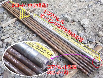写真中①のコアバレルを先端として孔を掘削します。掘り進める孔の深さに応じ、②ロッドを必要な本数分連結していきます。