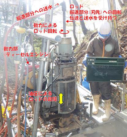 ビット(刃)を先端としてコアバレル、ロッドを取付け、これらを回転することで地盤を掘削、孔を掘り進めます。孔が深くなるのに合わせ、ロッドを足していきます。